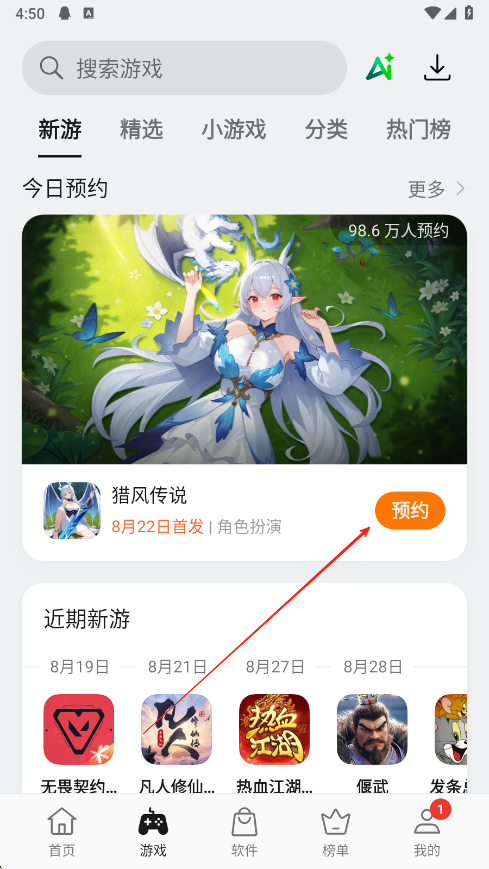 3、切換到游戲頁(yè)面,可看到新游,精選,小游戲等分類,在今日預(yù)約板塊,看到感興趣的游戲如獵風(fēng)傳說(shuō),點(diǎn)擊預(yù)約按鈕,即可預(yù)約該游戲,也能瀏覽近期新游等內(nèi)容。