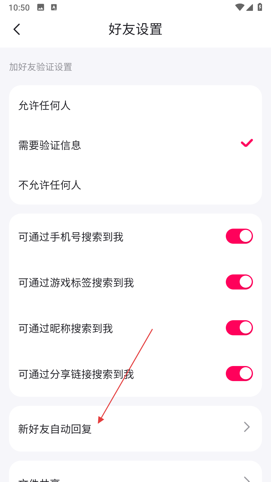 3、在好友設(shè)置界面中,找到新好友自動回復選項并點擊,進入新好友自動回復設(shè)置頁面。