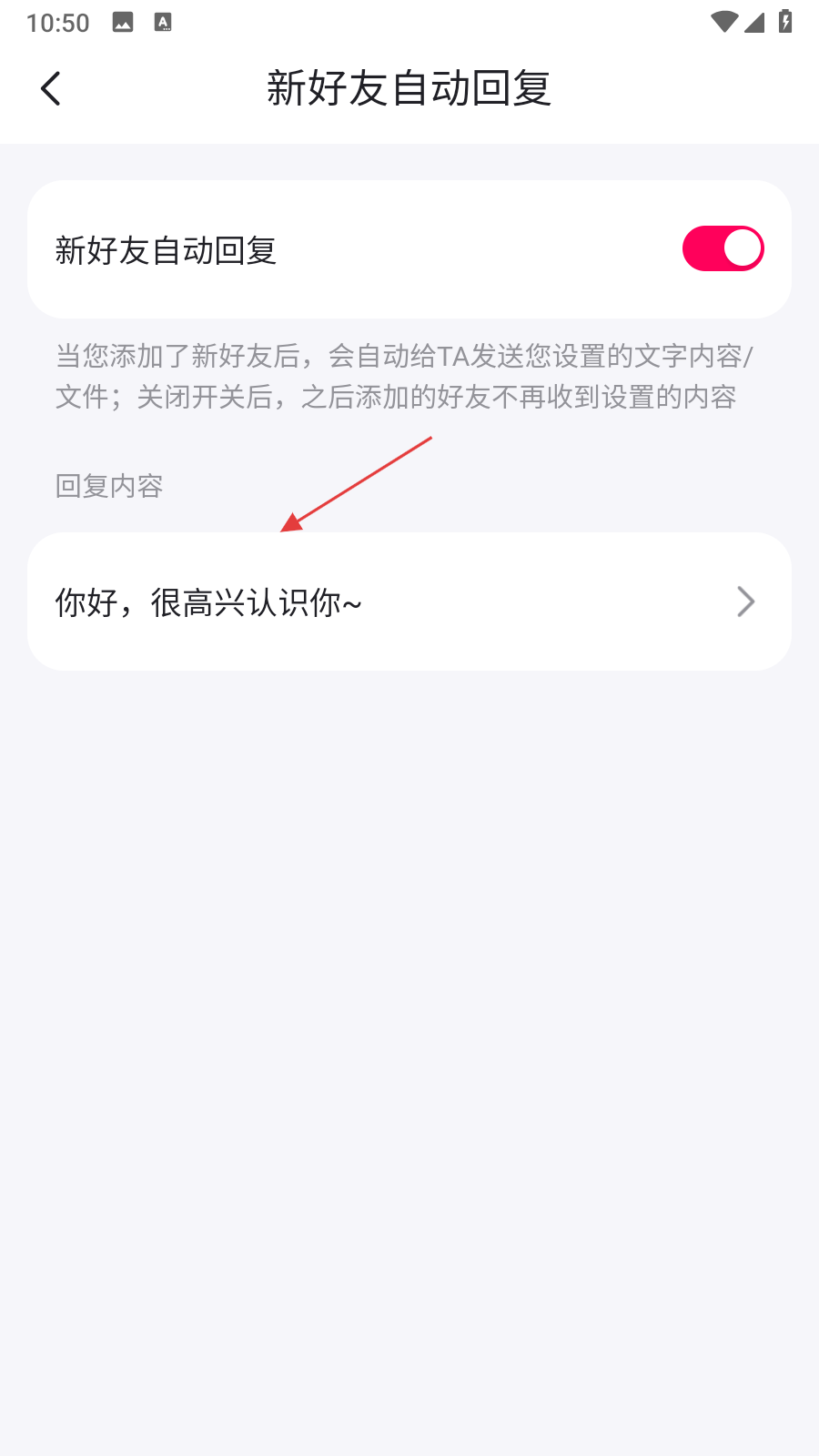 4、在新好友自動回復設(shè)置頁面中,找到新好友自動回復開關(guān)并點擊開啟,然后點擊回復內(nèi)容輸入框。