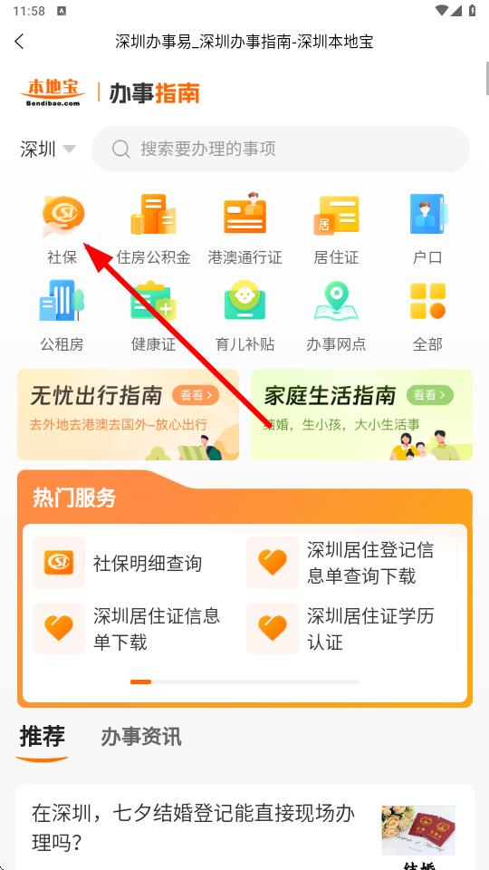2、進入“辦事指南”頁面后,頁面會顯示出針對不同城市的多種辦事分類 。確保定位為“深圳”,然后點擊“社?!边x項,進入深圳社保相關(guān)的辦事指南頁面。