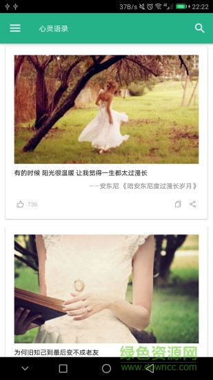 心靈語錄app是一款非常實用的閱讀app,這里收錄了海量的唯美句子、各種精美文章、心情語錄,在這里你可以暢享文字的海洋世界,喜歡的朋友可以來綠色資源網(wǎng)下載體驗!