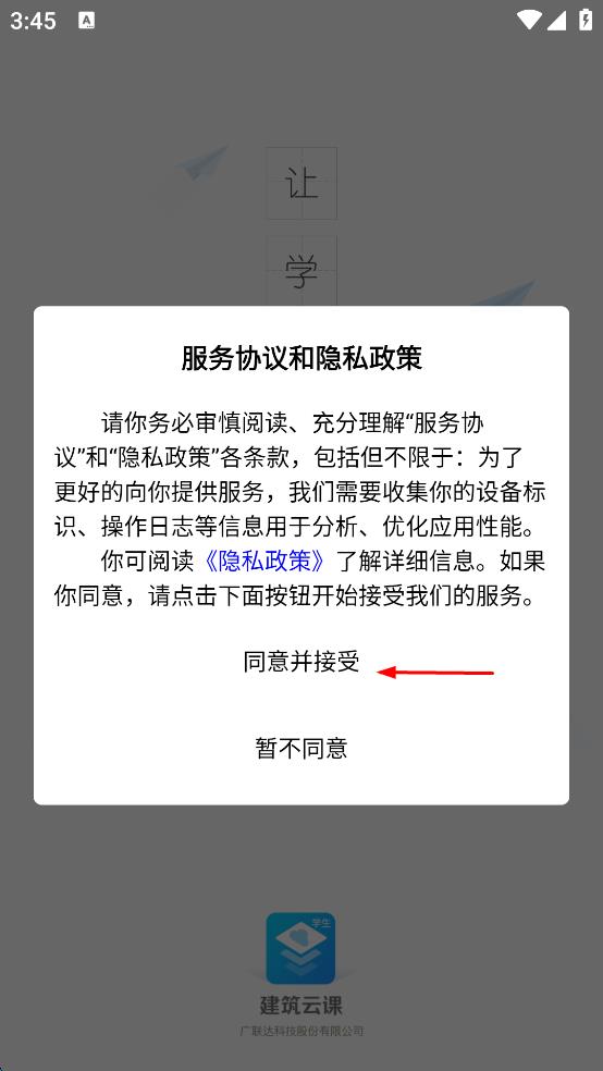 1、打開會彈出服務協(xié)議和隱私政策提示框,仔細閱讀相關內(nèi)容后,點擊“同意并接受”按鈕,進入APP登錄界面。