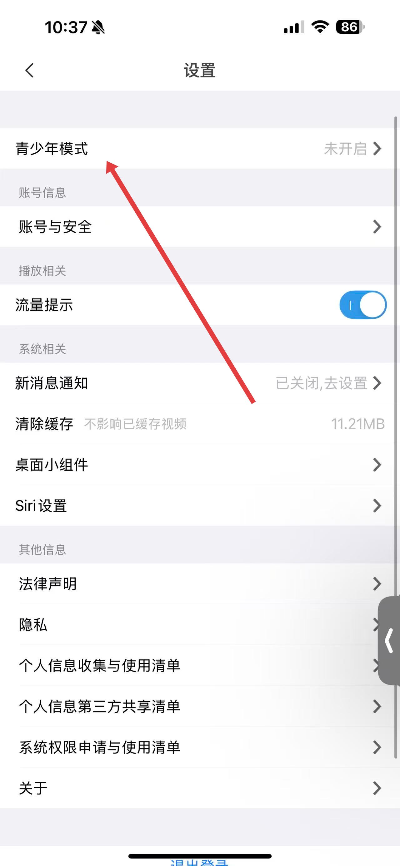 3、在設置界面里,點擊青少年模式選項,進入青少年模式設置頁面。