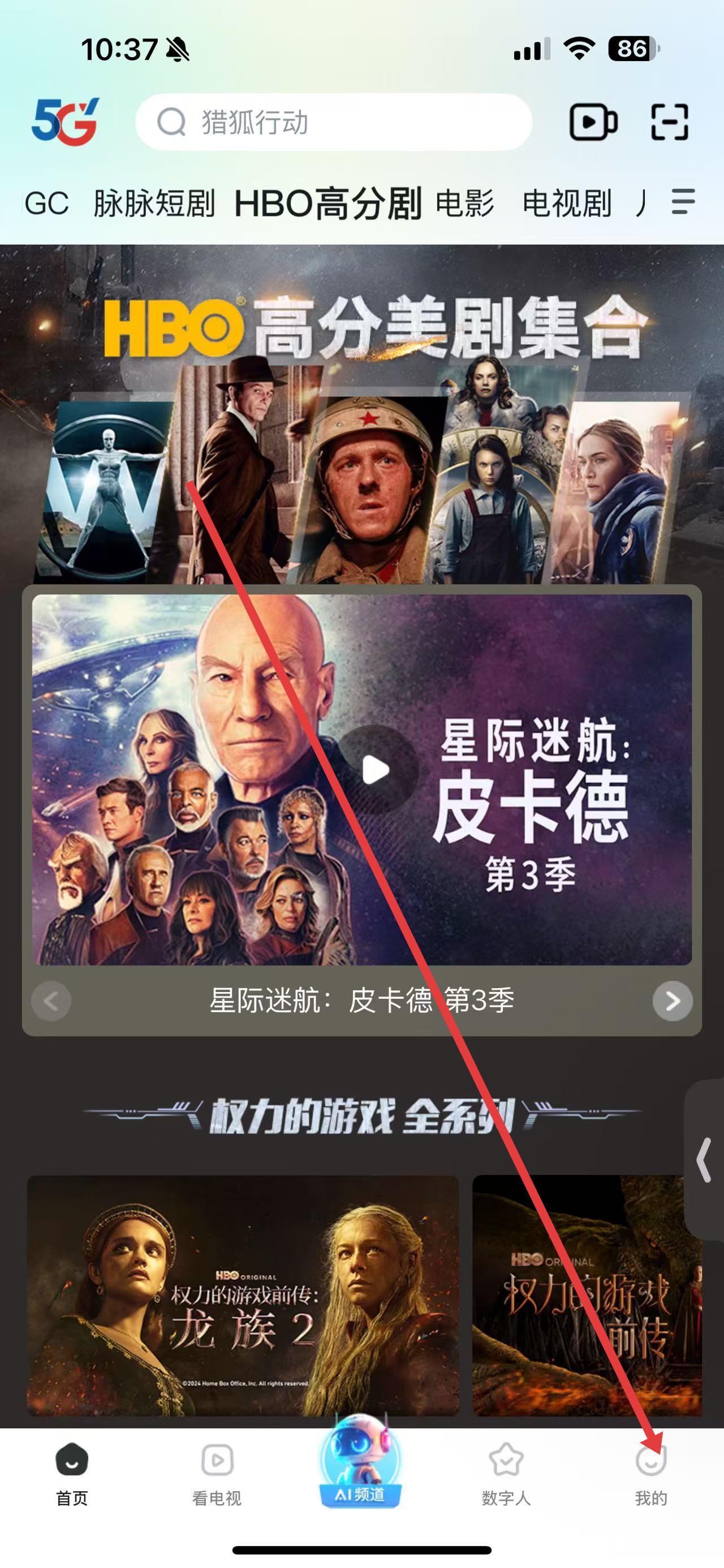 1、打開天翼超高清應用,點擊底部導航欄最右側的我的選項,進入個人頁面。