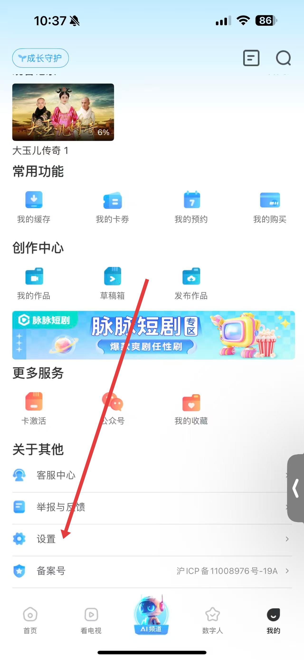 2、在個人頁面中,下滑找到設置選項并點擊,進入設置界面。