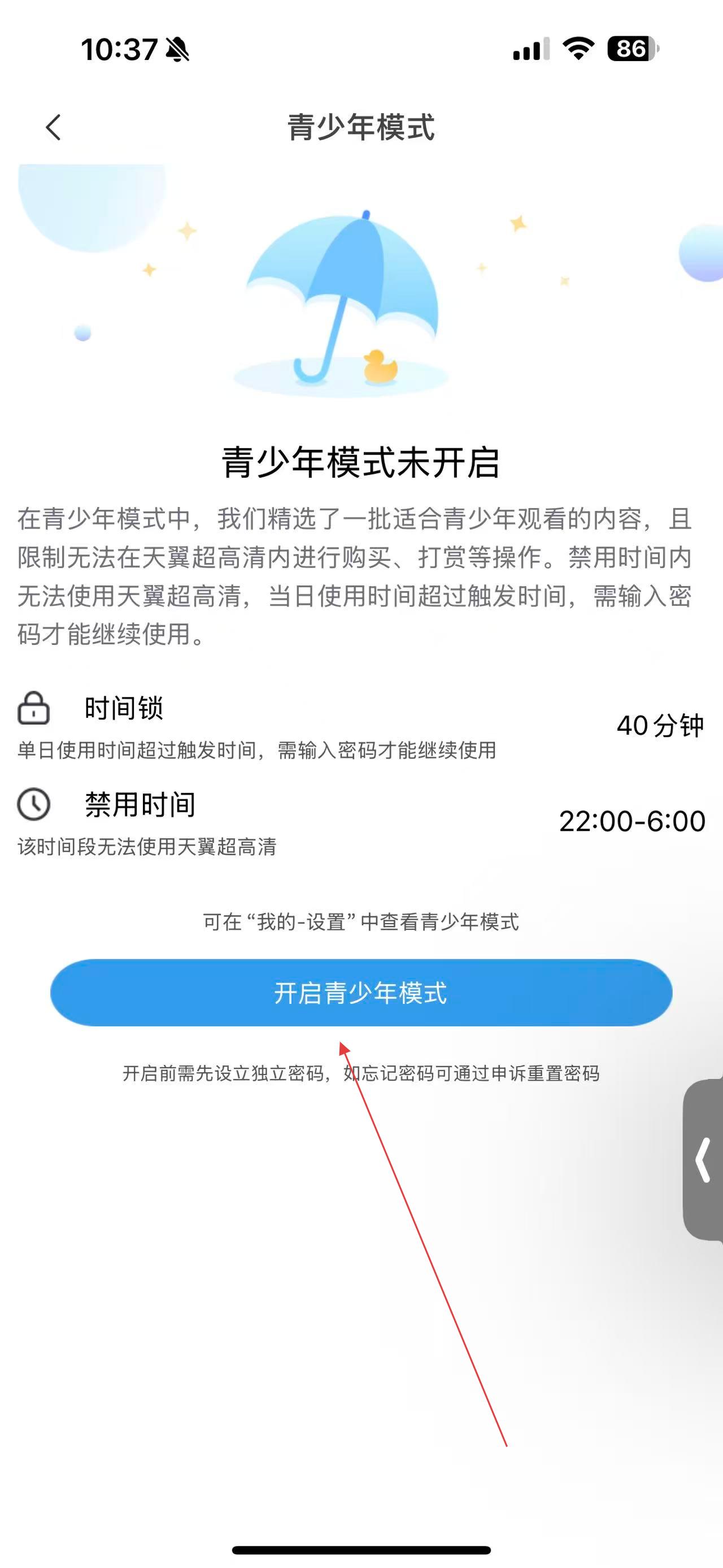4、在青少年模式設置頁面,點擊開啟青少年模式按鈕 ,按照提示設置獨立密碼后,即可成功開啟。