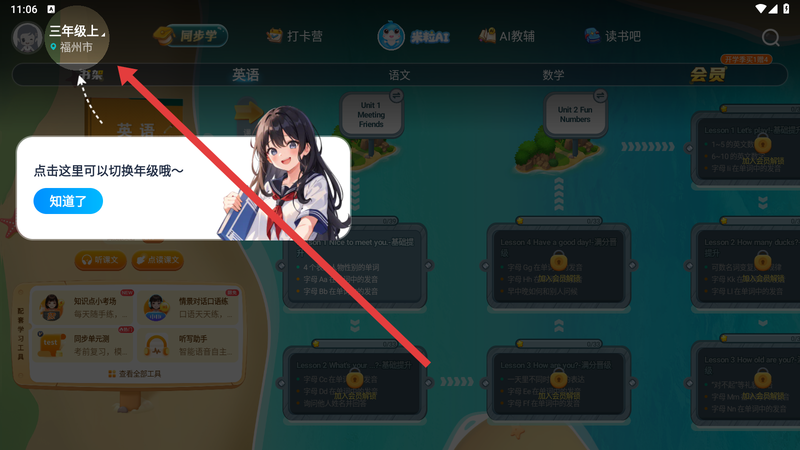 1、通過點(diǎn)擊頭像旁邊的年級區(qū)域,可以進(jìn)行切換年級。
