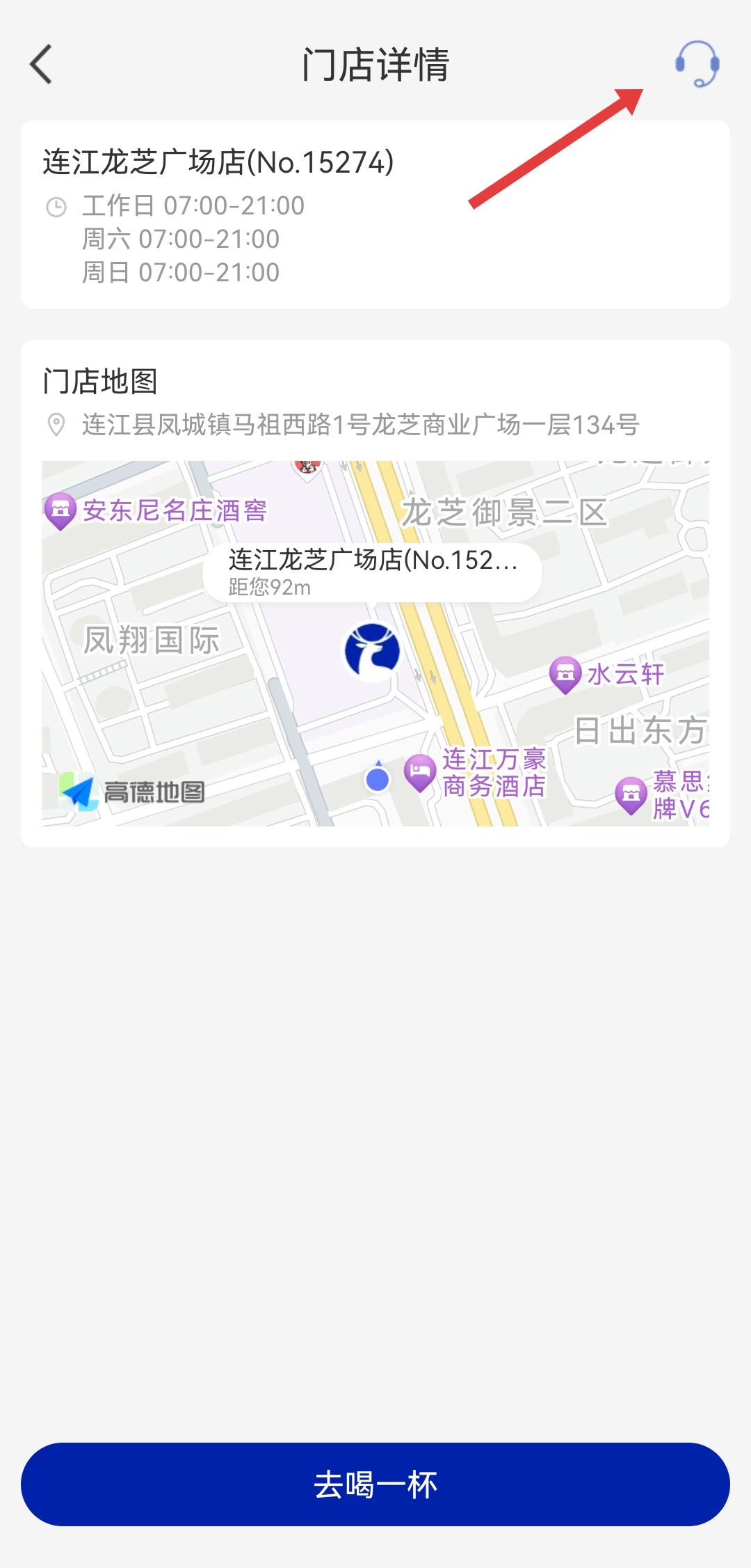2、在門店詳情頁面右上角,找到耳機形狀的客服圖標并點擊,跳轉至在線客服聊天界面。