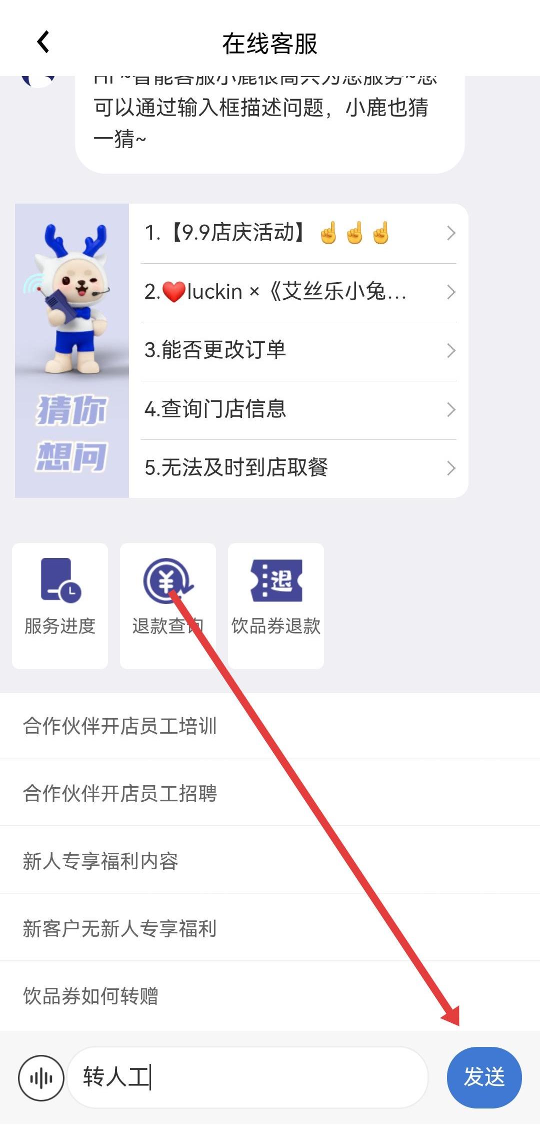 3、在在線客服的底部輸入框中,輸入轉人工字樣,點擊右側藍色發(fā)送按鈕,發(fā)送后等待系統(tǒng)響應。