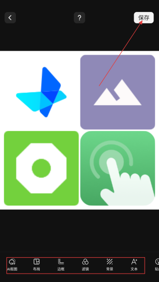 3、進(jìn)入拼圖編輯界面,可對(duì)拼圖的布局、邊框等進(jìn)行調(diào)整,調(diào)整完成后點(diǎn)擊右上角的保存按鈕。