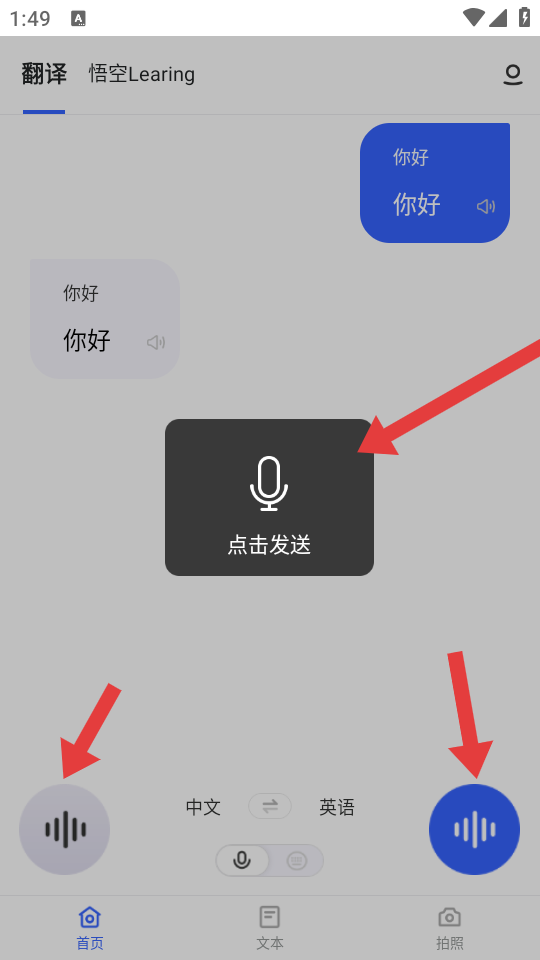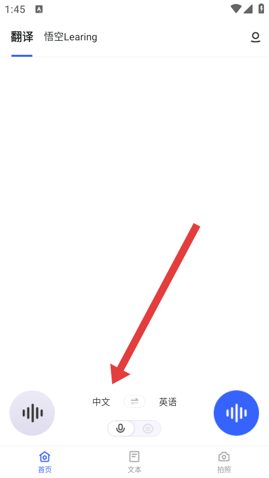 3、回到前面的頁面,點(diǎn)擊左側(cè)麥克風(fēng)說出需要翻譯的內(nèi)容,右側(cè)麥克風(fēng)可播放翻譯后的語音。