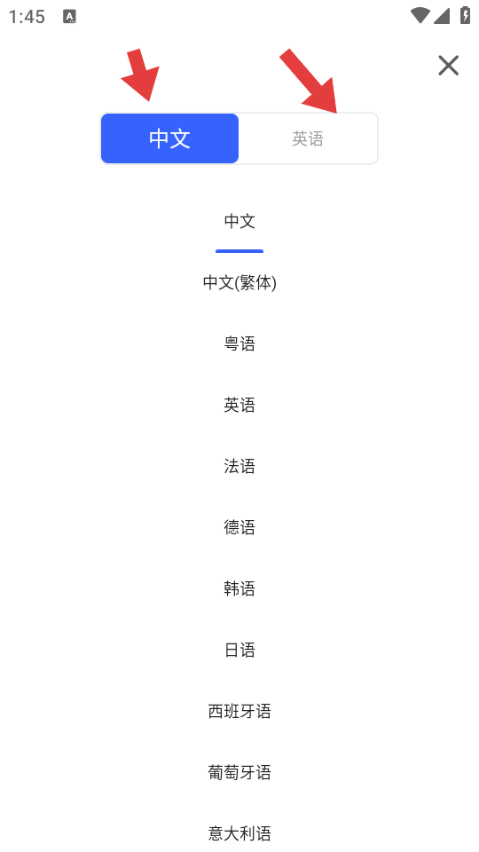 2、在語言選擇界面,分別點(diǎn)擊中文、英語等選項(xiàng),設(shè)置需要翻譯的源語言和目標(biāo)語言。