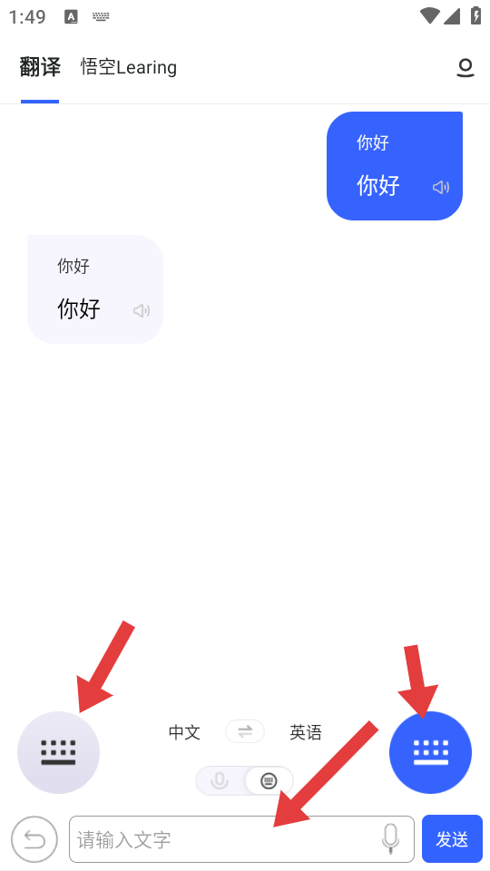 4、切換文字輸入功能,點(diǎn)擊請(qǐng)輸入文字輸入框,輸入要翻譯的文本點(diǎn)擊發(fā)送,獲取文字翻譯結(jié)果。