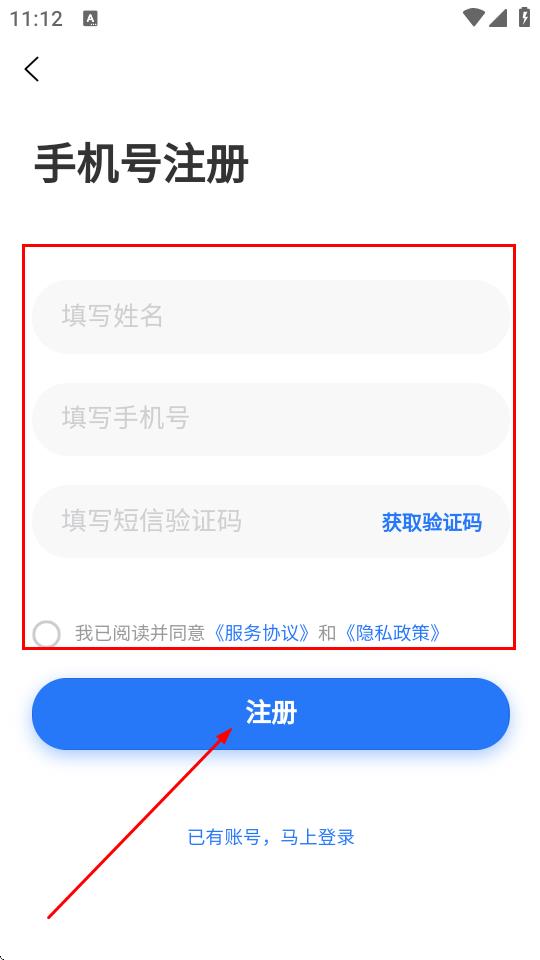 5、進(jìn)入手機(jī)號注冊頁面,填寫姓名、手機(jī)號、驗證碼,勾選同意服務(wù)協(xié)議和隱私政策,點擊注冊。