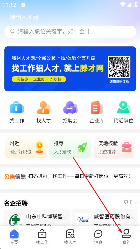 1、打開滕州人才網(wǎng)APP,點擊底部導(dǎo)航欄中的我的。