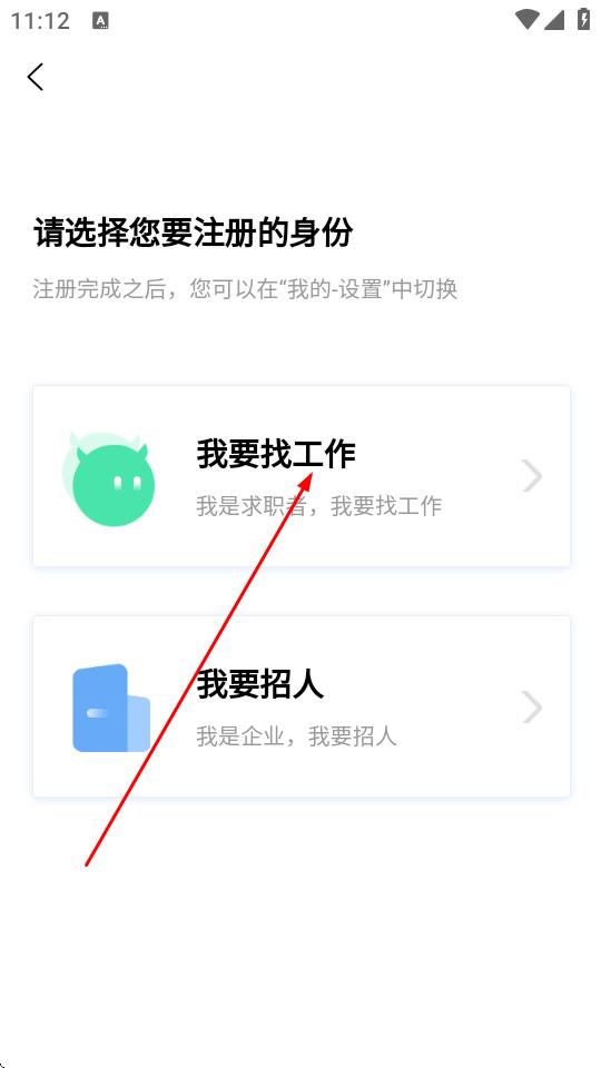 4、在請選擇您要注冊的身份頁面,選擇我要找工作。