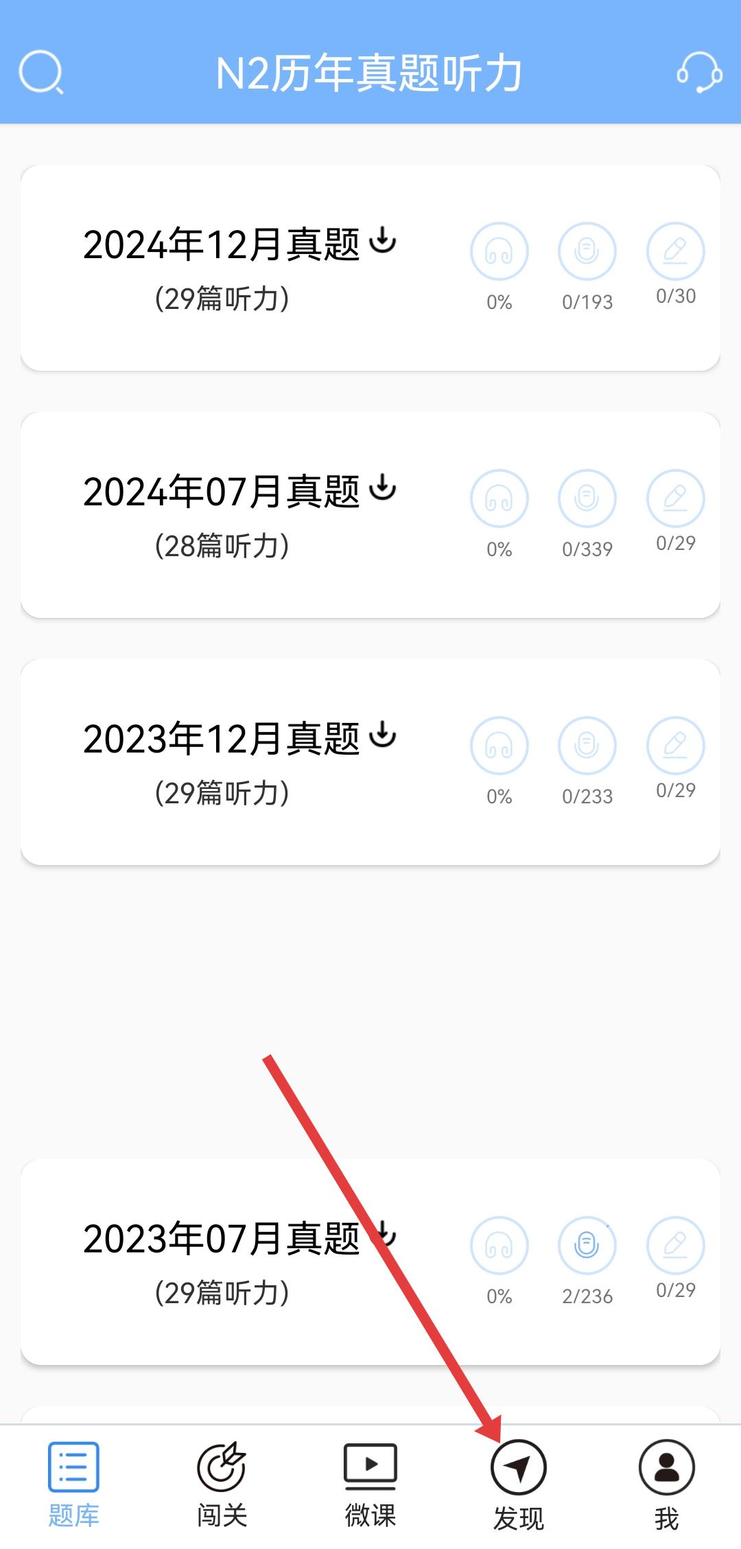 1、在日語學(xué)習(xí)APP題庫頁面,點擊底部發(fā)現(xiàn),進入發(fā)現(xiàn)頁面。