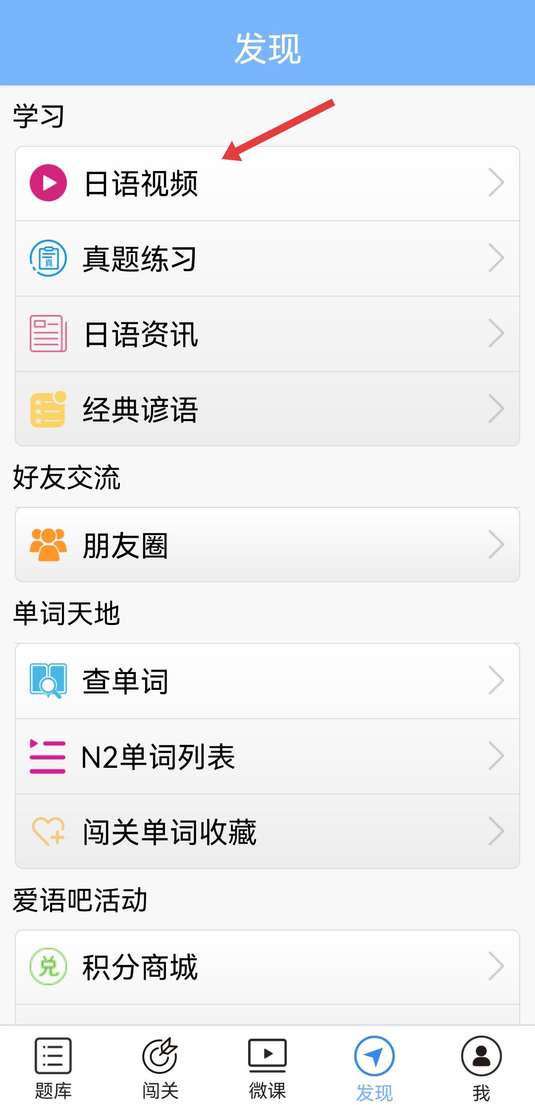 2、在發(fā)現(xiàn)頁面,點擊日語視頻的選項,進入日語視頻列表頁面。