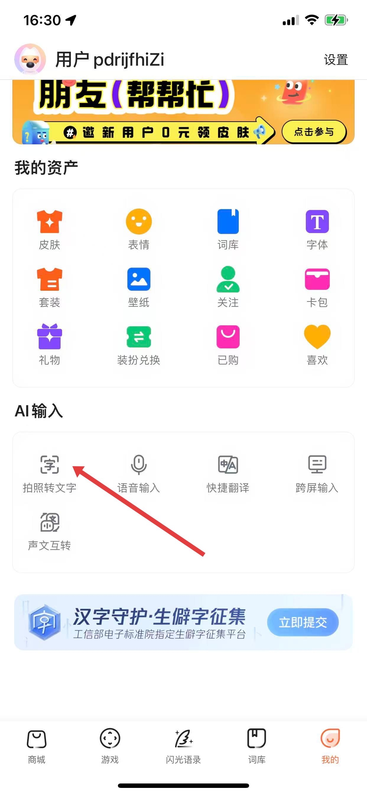 2、在個(gè)人界面的AI輸入板塊中,點(diǎn)擊拍照轉(zhuǎn)文字選項(xiàng)。