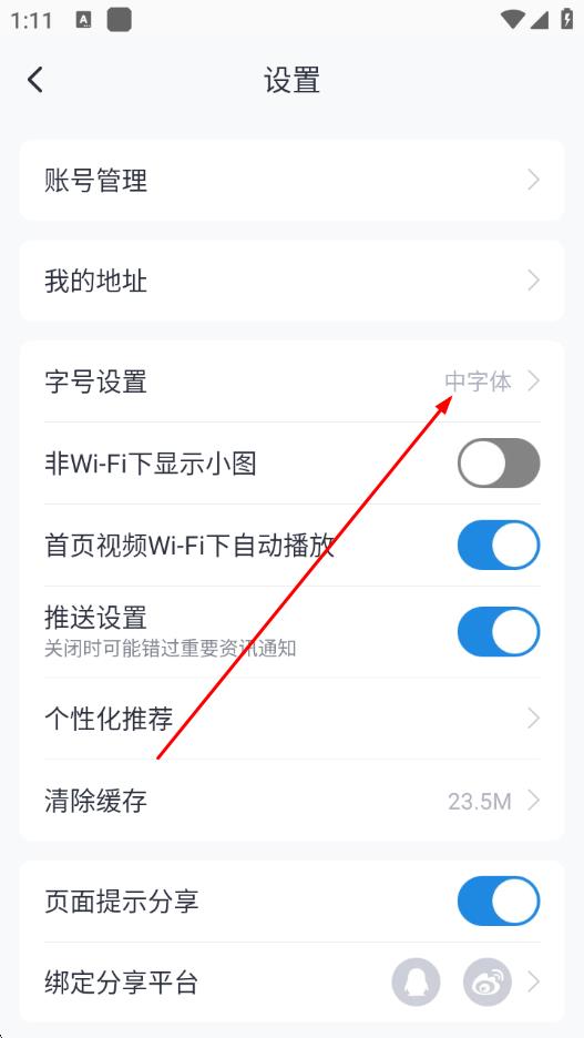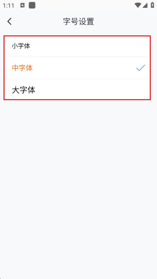 4、在字號(hào)設(shè)置頁面,根據(jù)需求選擇小字體、中字體或大字體。