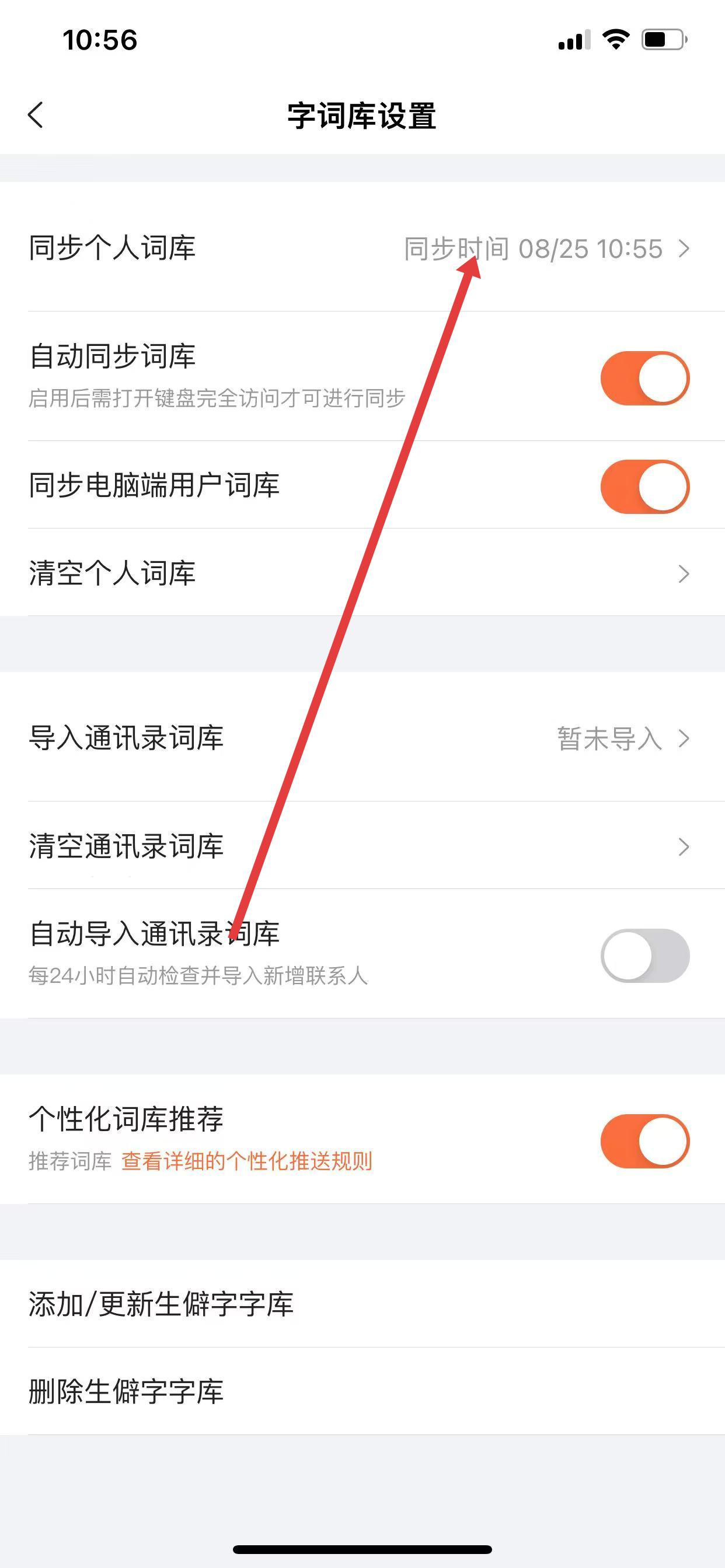 3、在字詞庫設(shè)置頁面,點擊自動同步詞庫開關(guān),即可同步時間,完成個人詞庫同步。