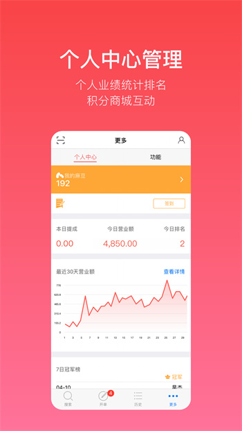 5.個人業(yè)績統(tǒng)計、積分商城活動等功能為員工提供更多參與感,讓管理更高效。
