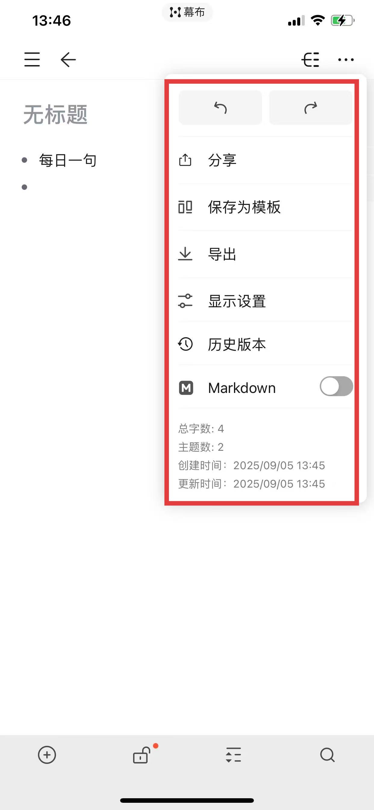 4、內(nèi)容編輯完成后,可進行分享、保存為模板、導出等操作,也能查看文檔總字數(shù)、主題數(shù)等信息。