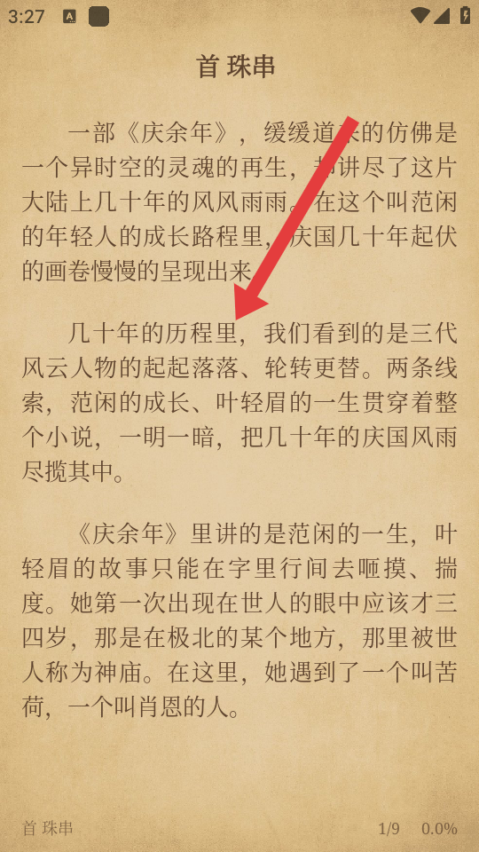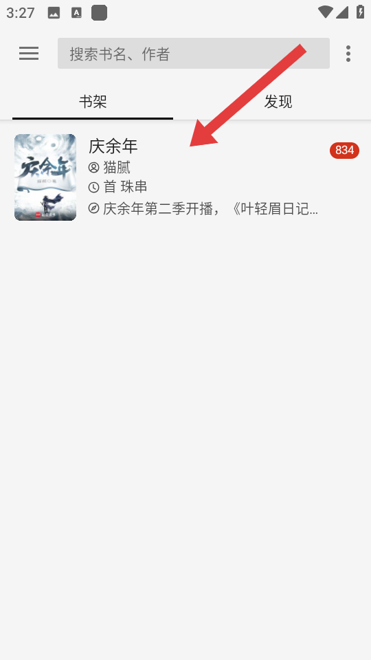 1、在老子搜書的書架頁(yè)面,點(diǎn)擊要調(diào)整目錄的書籍如慶余年,進(jìn)入書籍閱讀界面。