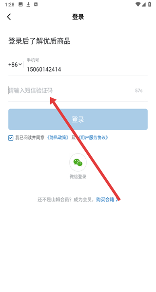 4、在填寫好手機號點擊獲取驗證碼后,在下方輸入框中輸入驗證碼點擊登錄按鈕,即可完成登錄操作。