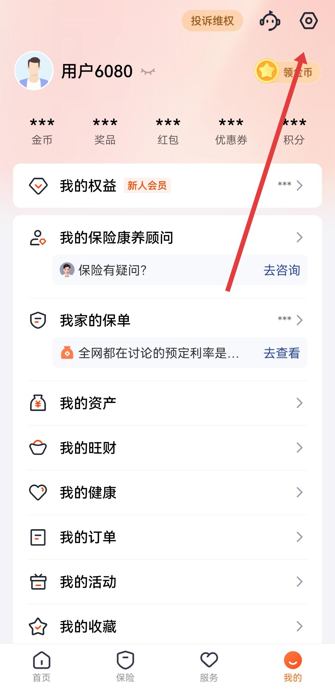 1、打開(kāi)平安金管家APP,進(jìn)入底部導(dǎo)航欄我的頁(yè)面,點(diǎn)擊右上角齒輪狀設(shè)置圖標(biāo),進(jìn)入個(gè)人設(shè)置的界面。