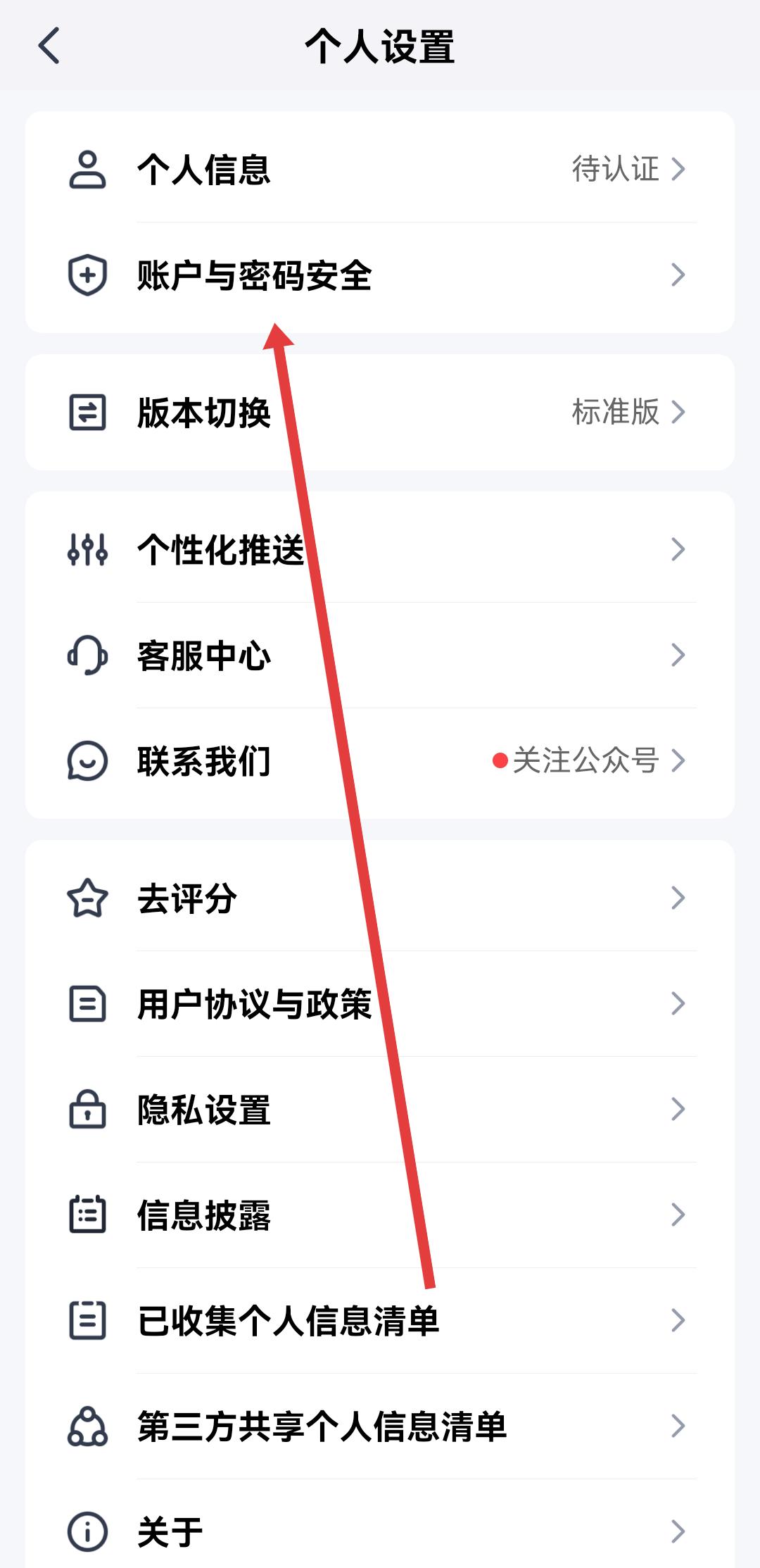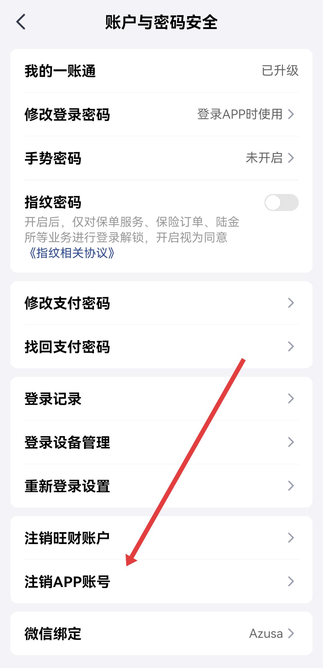 3、在賬戶與密碼安全頁(yè)面中,點(diǎn)擊注銷(xiāo)APP賬號(hào)的選項(xiàng),若關(guān)聯(lián)旺財(cái)賬戶,需先清空其余額并單獨(dú)注銷(xiāo)旺財(cái)賬戶。