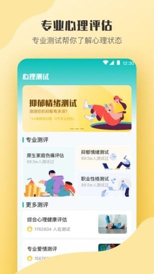 2.為所有用戶提供了在線心理咨詢平臺(tái),APP有著最為專業(yè)的心理咨詢測(cè)評(píng),幫你了解自己的心理狀況