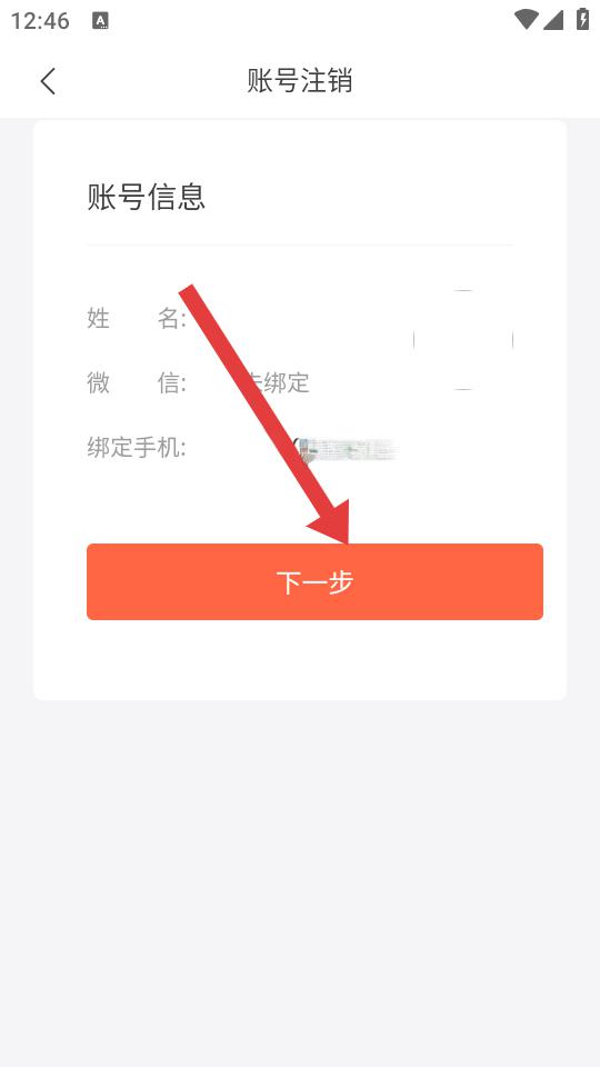 4、在賬號注銷頁面,點(diǎn)擊下一步按鈕,進(jìn)入注銷協(xié)議的確認(rèn)頁。