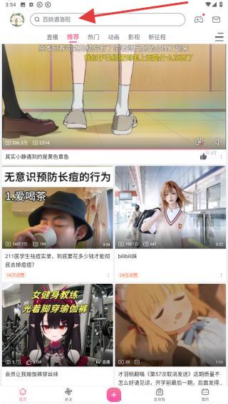 1、打開嗶哩嗶哩APP進(jìn)入到首頁,點(diǎn)擊頂部搜索框激活輸入法。