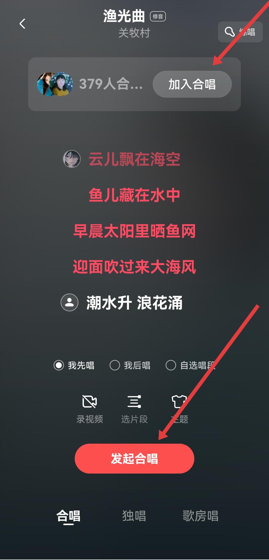 1、打開全民K歌,找到想合唱的歌曲,進入歌曲界面后,可以選擇點擊加入合唱或者發(fā)起合唱的按鈕。
