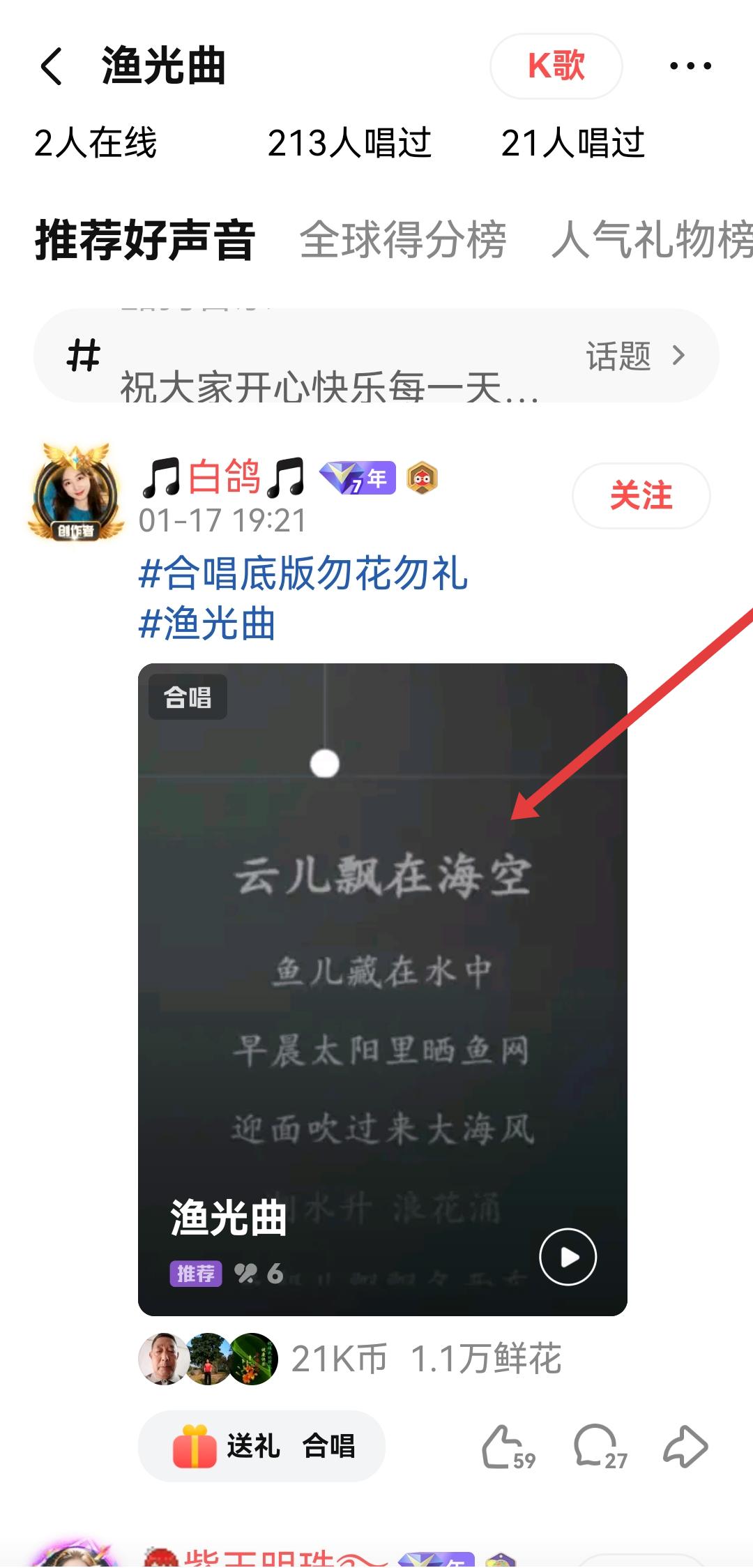 2、這里我們選擇加入合唱,進入漁光曲的合唱頁面,選擇自己想要合唱的人,點擊作品進入合唱。