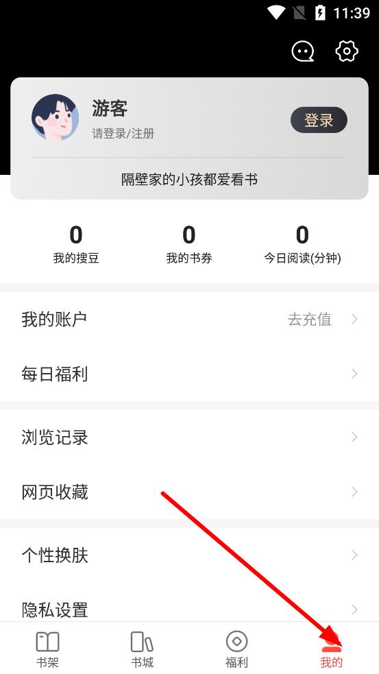 1、打開搜狗閱讀應(yīng)用,點(diǎn)擊底部導(dǎo)航欄的我的選項(xiàng),進(jìn)入個(gè)人中心頁面。