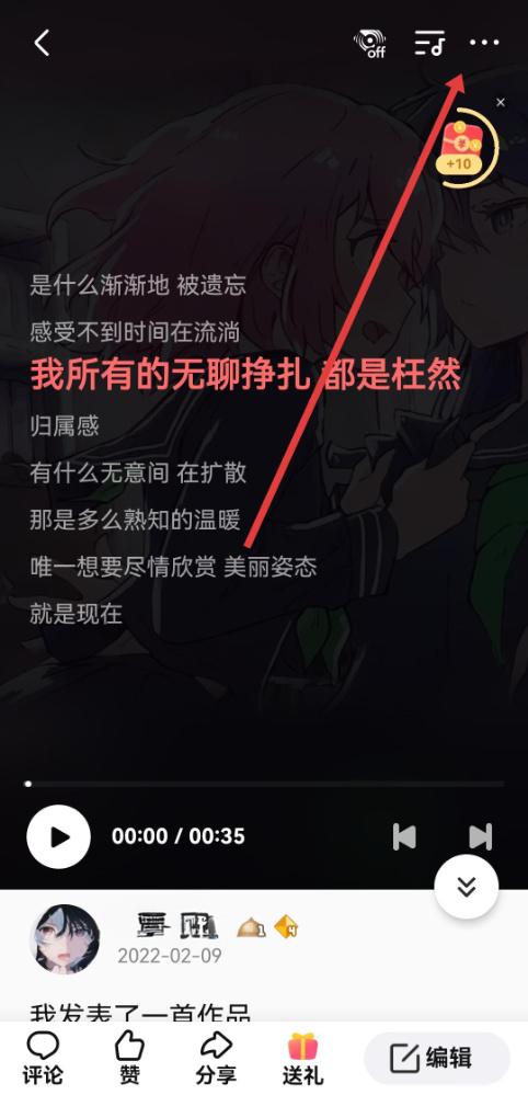1、打開(kāi)全民K歌,進(jìn)入自己發(fā)布的作品頁(yè)面,點(diǎn)擊作品右上方的···更多按鈕,進(jìn)入作品操作選項(xiàng)界面。