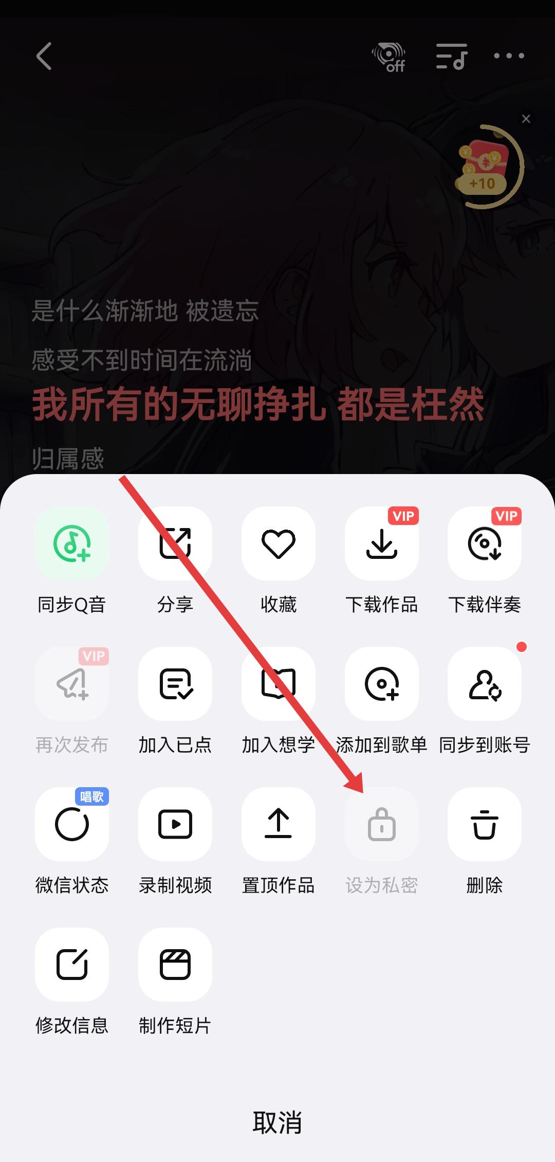 2、在彈出的操作選項(xiàng)界面中,找到并點(diǎn)擊設(shè)為私密按鈕,這是將作品隱藏的關(guān)鍵操作步驟。