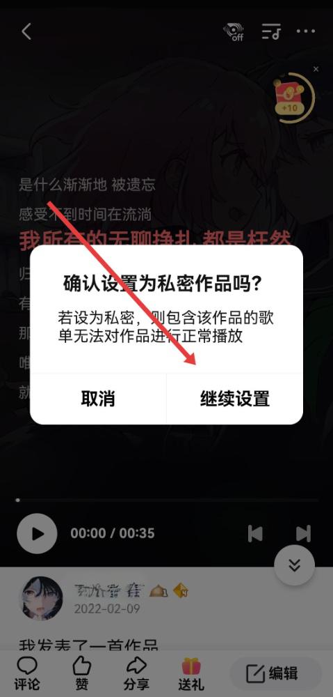 3、界面會(huì)彈出確認(rèn)提示框,點(diǎn)擊繼續(xù)設(shè)置,即可成功將該作品隱藏,他人無(wú)法在你的主頁(yè)看到此作品。