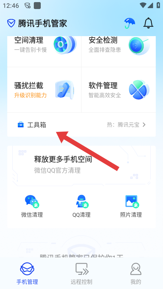 1、打開騰訊手機管家APP,進入手機管理的頁面,點擊工具箱的選項,進入工具箱界面。