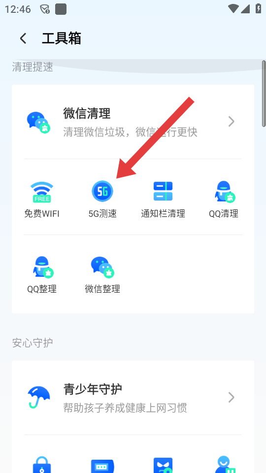 2、在工具箱頁面的清理提速區(qū)域,需要點擊5G測速的圖標,然后跳轉(zhuǎn)至5G測速的頁面。