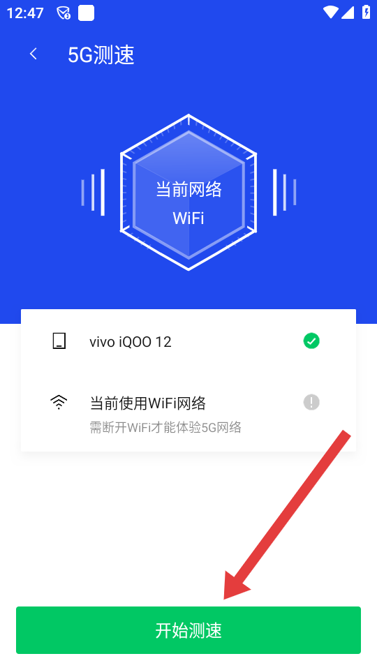 3、在5G測速的頁面,需要點擊底部開始測速按鈕,即可檢測當前網(wǎng)絡(luò)WiFi或5G的速度。