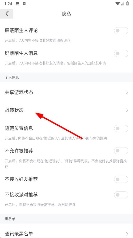 4、在隱私設(shè)置頁面,點擊戰(zhàn)績狀態(tài)選項,進入戰(zhàn)績狀態(tài)設(shè)置界面。