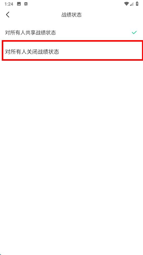 5、在戰(zhàn)績狀態(tài)設(shè)置界面,選擇對所有人關(guān)閉戰(zhàn)績狀態(tài)選項,即可關(guān)閉戰(zhàn)績顯示。