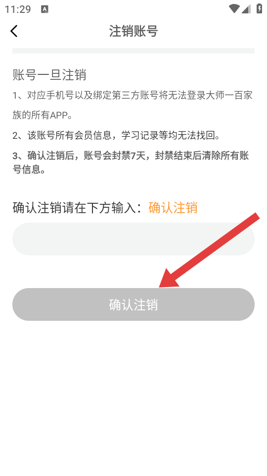 4、在確認(rèn)注銷頁(yè)面,輸入確認(rèn)注銷后點(diǎn)擊確認(rèn)注銷,完成賬號(hào)注銷操作。