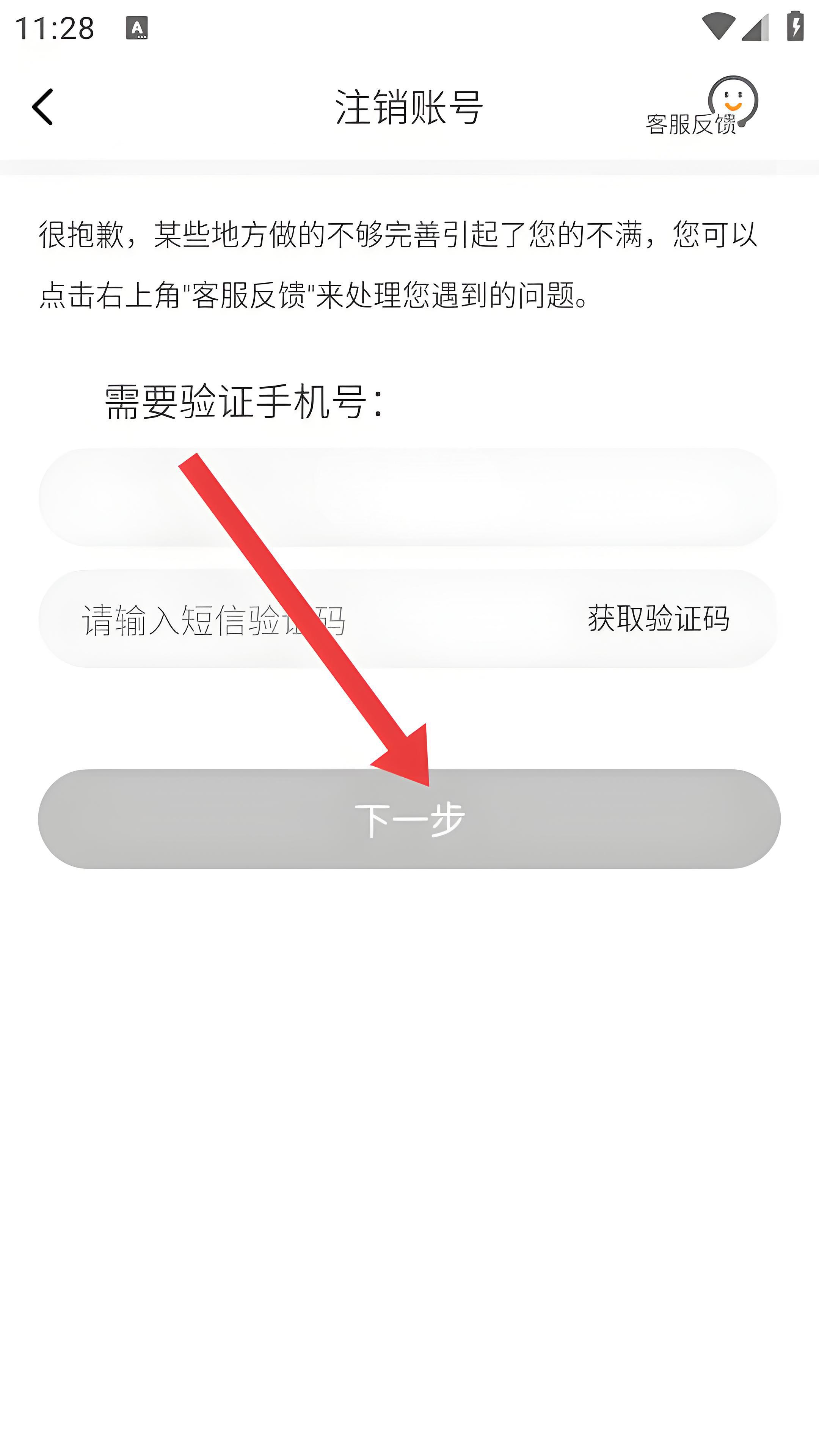 3、在注銷賬號(hào)頁(yè)面,輸入短信驗(yàn)證碼后點(diǎn)擊下一步,進(jìn)入確認(rèn)注銷環(huán)節(jié)。
