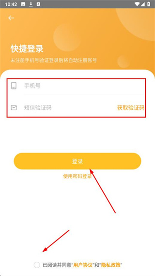 3、輸入手機號,填入短信驗證碼,勾選協(xié)議’,點擊登錄。