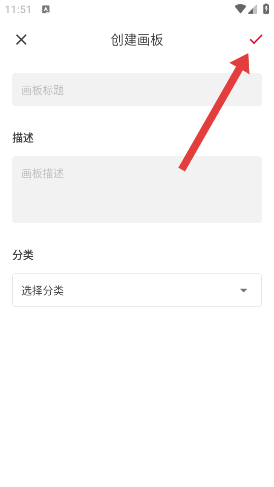 3、在創(chuàng)建畫板頁面,填寫畫板標(biāo)題、描述,選擇分類等信息后,點擊右上角的對勾圖標(biāo)。