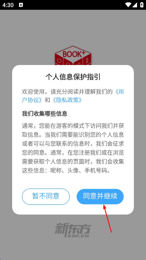 1、打開書加加App,在個(gè)人信息保護(hù)指引頁(yè)面,點(diǎn)擊“同意并繼續(xù)”按鈕。